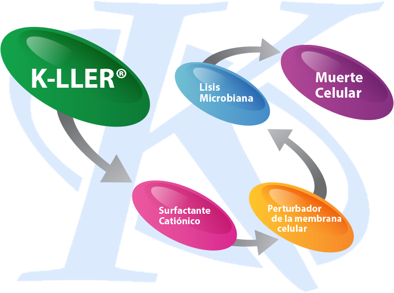K-LLER® es un surfactante catiónico que funciona como una sustancia perturbadora de membrana celular, actividad que conlleva a la lisis de cubiertas de microbianas y por tanto la muerte celular.