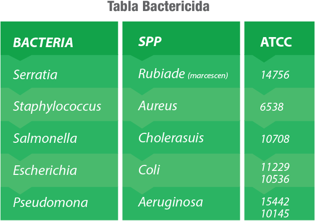 (4) Realizado por “Instituto Venezolano de Investigaciones Científicas (I.V.I.C.)”, en el marco de las condiciones de las normas establecidas en “The Association of Analytical Chemists - AOANC”; “The Association of Official Agricultural Chemists - AOAC”; “The Food and Drug Administration- FDA” Bactericida, para algunos microorganismos de la tabla abajo señalada, sin diluir, a los 5 minutos de exposición, realizado por varias instituciones a través de metodologías propias.