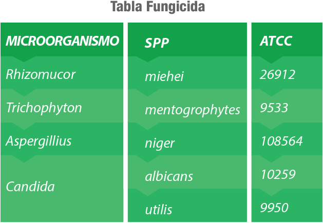 Fungicida, para los microorganismos de la tabla señalada, sin diluir, a los 5-30 minutos de exposición6,7.